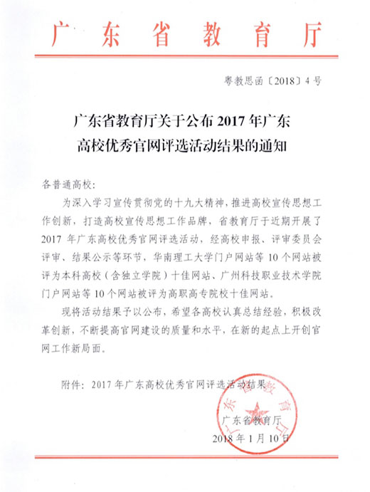 近日,由广东省教育厅主办,广东财经大学承办的2017年广东高校优秀官网评选结果揭晓,我校门户网站(http://www.gipe.edu.cn/)等10个网站被评为2017年广东省本科高校(含独立学院)十佳网站。